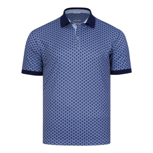 A short-sleeve performance polo featuring a clean geometric dot pattern in cool blue tones. Accented with a contrasting navy collar and sleeve cuffs, this shirt delivers a sharp, modern look. Lightweight and breathable, it offers all-day comfort and versatility, making it ideal for golf, business casual settings, or everyday wear. Made from 100% recycled REPREVEĀ® polyester with an athletic fit, this polo looks as good as it feels.
