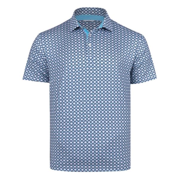 A short-sleeve performance polo featuring a refined geometric pattern in cool blue tones. Designed with a classic collar and button placket, this lightweight shirt delivers breathable comfort and a modern, polished look. Ideal for the golf course, business casual settings, or everyday wear, it offers versatile style both on and off the course. Made from 100% recycled REPREVEĀ® polyester with an athletic fit, this polo looks as good as it feels.