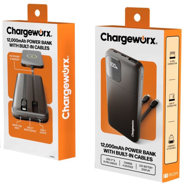 Chargeworx 12,000mAh Power Bank with Dual USB-A Ports & Built-In USB-C & Lightning Cables